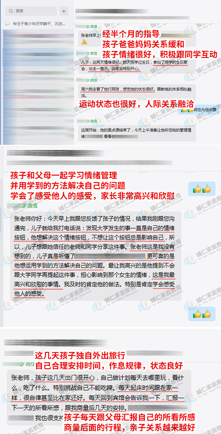 经辅仁专家老师半个月的指导,孩子爸爸妈妈逐渐学会了如何更好地沟通、理解和支持彼此,他们的关系因此得到了显著的缓和。父母双方的情绪状态也得到了极大的改善,孩子也在专家的指导下,开始积极与同学进行互动,尝试建立健康的人际关系。值得一提的是,在最近的一段时间里,孩子甚至独自外出旅行,这对他来说是一次难得的自我挑战和成长机会。在旅行中,他能够合理安排自己的时间,保持规律的作息,展现出良好的自我管理能力。这次旅行不仅让他的身心得到了放松和愉悦,还进一步巩固了他与父母之间已经建立起来的良好亲子关系。