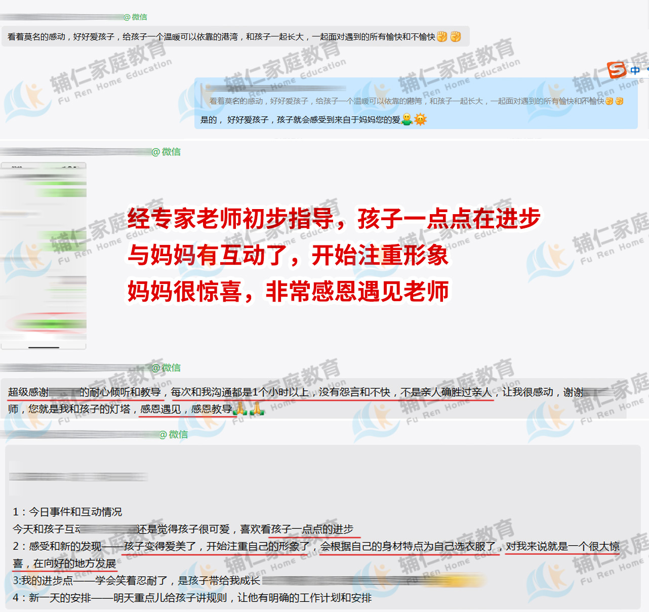 经辅仁专家老师初步指导,孩子一点点在进步,逐渐从自我封闭的状态中走出,与妈妈的互动日益增多,无论是日常对话还是情感交流,都显得更为自然与流畅。他开始注重自己的外在形象,无论是衣着打扮还是言行举止,都透露出一种积极向上的生活态度。这一系列的积极变化让妈妈感到无比惊喜与欣慰,对辅仁专家老师充满了感激之情。