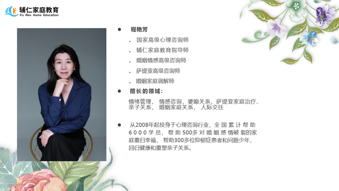 本次活动特邀辅仁家庭教育集团高级心理咨询师程艳芳老师主讲。作为家庭教育指导师、婚姻情感高级咨询师、萨提亚高级咨询师、婚姻家庭调解师中级婚恋咨询师,程艳芳老师自2008年投身心理咨询行业以来,在全国范围内累计帮助了6000名学员走出心理困境,助力500多对婚姻感情濒临破裂的家庭重拾往日的幸福,更成功引导300多位抑郁症患者和问题少年回归健康生活,重新构建起和谐融洽的亲子关系。